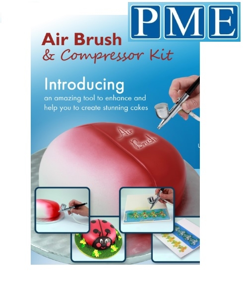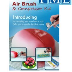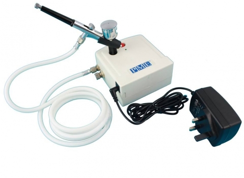 AirBrush sett. Pressa með straumbreyti ásamt kapli, könnu, dropateljara og leiðbeiningum á ensku.