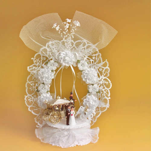 Brúðhjón og hestvagn á blúndugrunni með blúnduboga. Það eru tvö lítil börn undir styttunni til lukku.