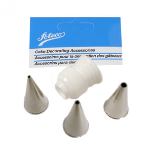 Stútahaldari og þrír kringlóttir sprautustútar til þess að skreyta og og skrifa á kökur, cupcakes og smákökur. Stútarnir passa á flesta venjulega stútahaldara. Stærðir stúta: 2, 4 og 6.